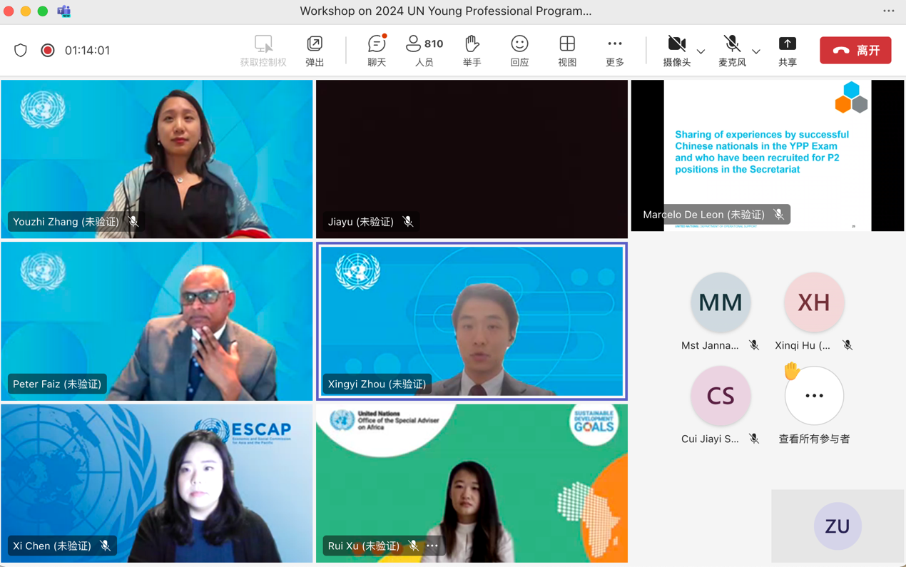 四位通过联合国青年专业人员计划(YPP)选拔成功入职联合国的中国籍青年专业人员分享了各自的职业发展经历、工作岗位职责、YPP备考经验以及联合国职业成长体验。交流互动环节,与会人员就申请者专业背景、学历门槛、实习实践经历等问题与嘉宾进行探讨。