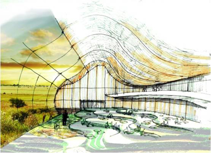 在中国馆的设计理念上,汪建松和创意团队成员达成了共识,打破四平八稳的设计套路,创造出更为开放、更具活力的空间,做“场域化的设计”。中国馆的“场域设计”理念以空间的起伏弯曲影响穿行其间的参观者的感受;建筑体的下方是通透的,麦田穿透建筑、一望无际,既消解了建筑的孤立性,也增强了空间的统一、延续和张力感。