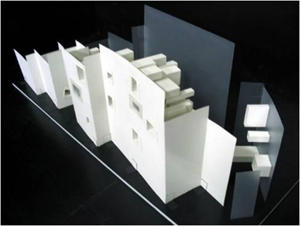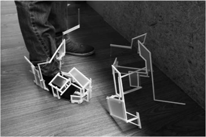 在环艺系开设的专业基础课《空间概念设计》课里,汪建松要求学生以“空间的粒子”为主题,设计一个具备封闭、半封闭和开放三种形态的空间,并幻想自己像尘埃、光线和风一样在其中游荡。一件作品尤令他印象深刻:在他的指导下,学生受《围城》这部小说的启发,以镂空方块与半透明塑料板为元素构成一座“迷城”,让外面的粒子想进来、里面的粒子想出去,人与空间在幻想中形成奇妙的流动关系。从一件小习作,足见空间语言的丰富性:它能以含蓄的方式表现复杂社会关系、带来强烈的空间张力。在两种材质夹成的空间里,透过白纸板上的方口,光线朦胧投入、显得温柔而神秘,吸引粒子的进入;方口连接着方形纸管,使粒子易于漂入;进入内部后,纸管和半透明塑料板之间形成了一个逼仄、压抑的空间,粒子迷失其中,却难以逃逸。