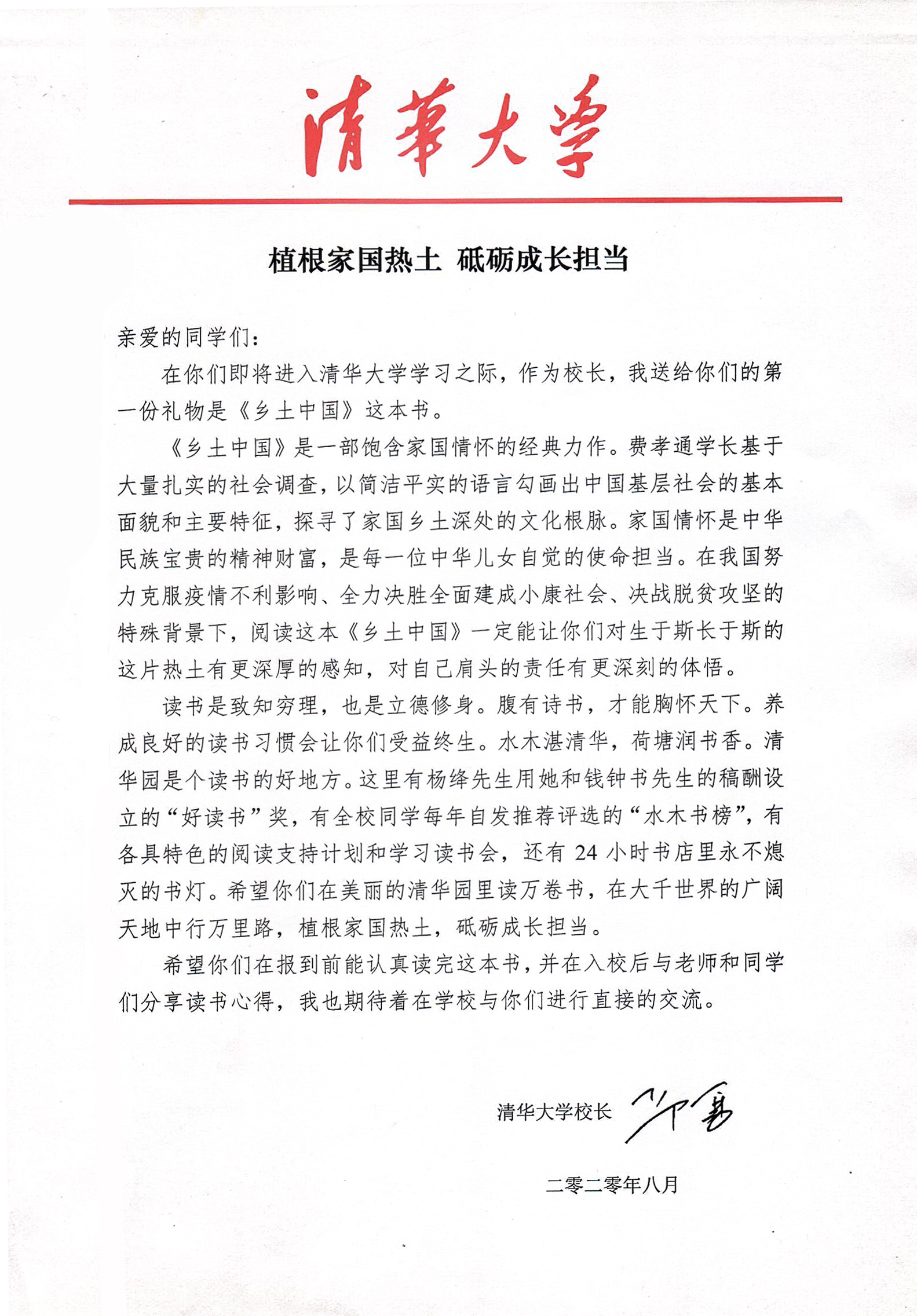 邱勇表示,读书是致知穷理,也是立德修身。腹有诗书,才能胸怀天下。邱勇在信中对新生说,“养成良好的读书习惯会让你们受益终生。水木湛清华,荷塘润书香。清华园是个读书的好地方。这里有杨绛先生用她和钱钟书先生的稿酬设立的‘好读书’奖,有全校同学每年自发推荐评选的‘水木书榜’,有各具特色的阅读支持计划和学习读书会,还有24小时书店里永不熄灭的书灯。希望你们在美丽的清华园里读万卷书,在大千世界的广阔天地中行万里路,植根家国热土,砥砺成长担当。”邱勇鼓励新生在报到前读完这本书,他也期待着在学校与他们进行直接的交流。