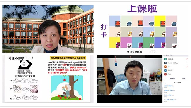 在PTN项目师生的共同努力下,开课第一周,5个模块课顺利开课,教学情况整体良好。把课堂从教室搬到屏幕前,这对于大多数老师都是第一次尝试。面对未曾接触过的授课方式,老师们选择迎难而上,从“小白”做起,利用开学前时间积极参加培训,不断摸索探究,以求高质量完成教学任务。张数一老师采用了雨课堂和zoom会议同时直播授课的方式,学生可以通过zoom实时给老师课堂反馈,提出问题,老师及时回答。然后课下可以通过荷塘雨课堂复习课上不会的知识点,取得了很好的效果。向烨老师采用了腾讯会议投屏,同时结合手写板,旁边的聊天窗口还可以随时提问,学生们表现很积极,课堂进行得很顺利。曹鹏老师在直播授课的同时,考虑到可能存在的网络突发故障情况,将授课内容录制并上传到腾讯微云平台,方便学生重新观看学习。此外,老师们想方设法提高课程吸引力,避免隔着屏幕照本宣科,注重与学生的交流,课堂氛围温馨而幽默。那洁老师还设置了清华专属的上下课铃声,让网络授课充满仪式感。