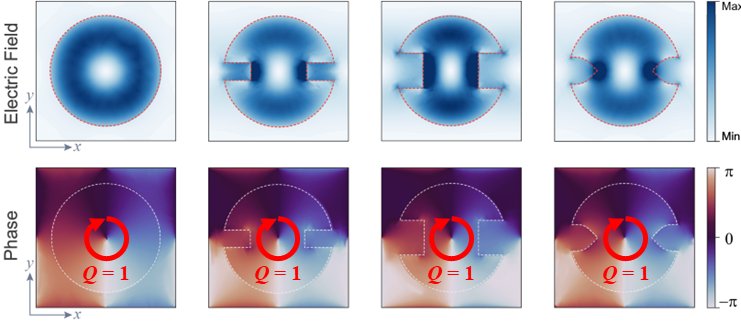 具有对结构微扰免疫的拓扑共振模式。其电场分布在结构中心呈现一个奇点,相位分布具有非平庸拓扑荷,不受结构微扰的影响。